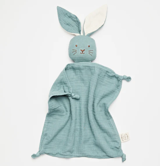 The sweetest bunny security blanket made from 4 layers of super soft GOTS certified organic muslin.