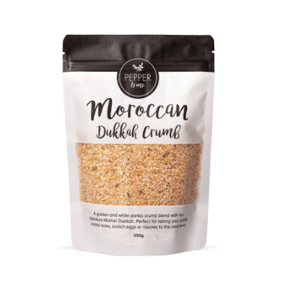 This custom Pepper & Me blend combines just the right amount of Panko with The Mother Dukkah and a dash of extra seasoning and sesame seeds and is the perfect crumb for chicken, fish or beef. An extra tasty, crunchy crumb will take your chicken or eggplant parmigiana to a new level. Sprinkle the Moroccan Dukkah Crumb on your pasta or potato bake, and take your Scotch eggs and rissoles to the next level.