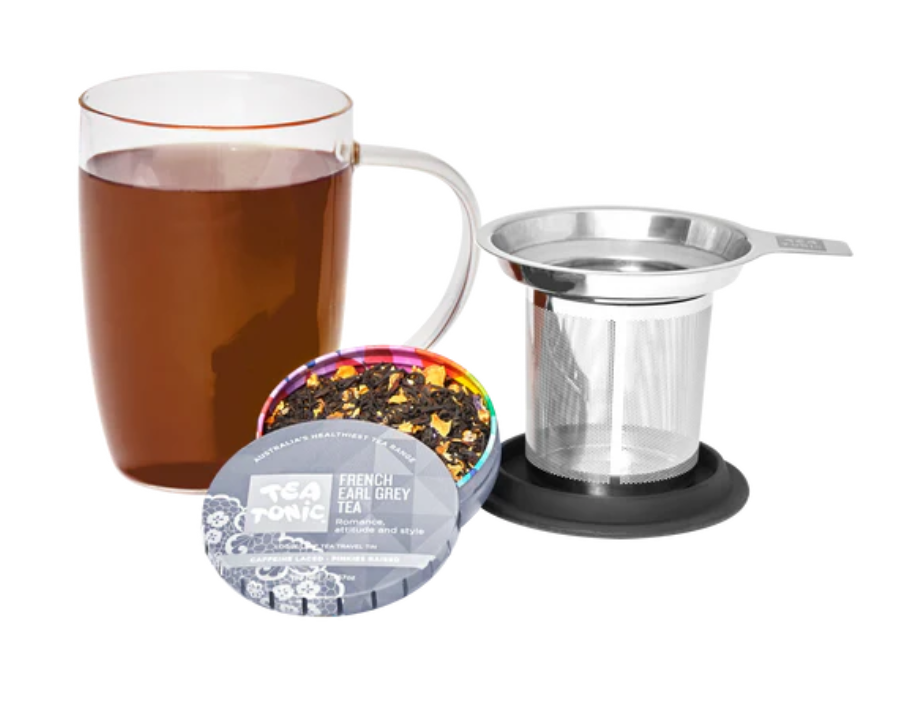 This stylish tea mug is designed for a simple and clean way of brewing one fresh cup of tea. This cup is made out of glass and holds 400ml of tea. The extra fine infuser enables you to brew fine cut teas and the lid functions as a drip dish for your infuser and as a lid. Indulge and embrace your hug in a mug. Including bonus French Earl Grey Tea Loose Leaf Travel Tin.